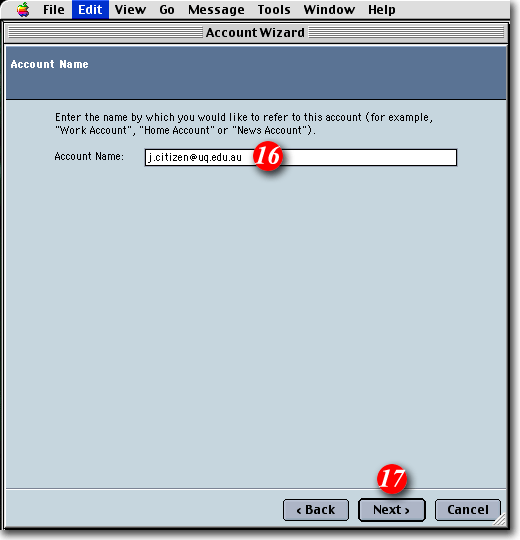 | 16)Enter a name for the account. This can be anything you like, although it's often a go.d idea to keep the default entry to make the account easy to identify. |
