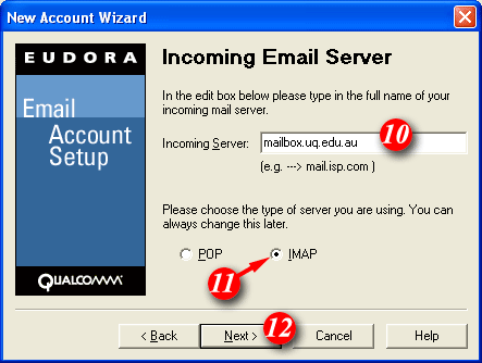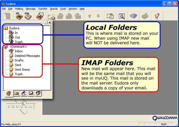 | Eudora is now setup to receive email from your central email account using the IMAP protocol.The major difference between POP3 & IMAP is that your mail will be stored on the mail server and can be accessed using webmail or another IMAP enabled email program. |