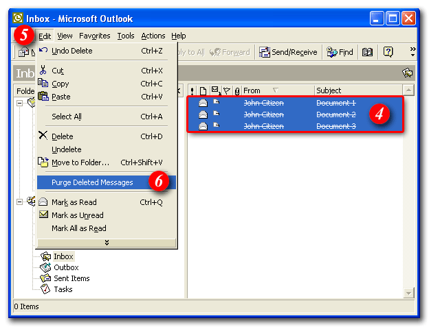 | 6)Select 'Purge Deleted Messages' - all mail in a status of 'Deleted' will be removed from your Inbox |